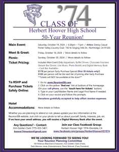 We are encouraging everyone to RSVP and purchase their tickets ONLINE with a credit card to manage finances easier. For those classmates who MUST pay by check or Zelle, email us for instructions.